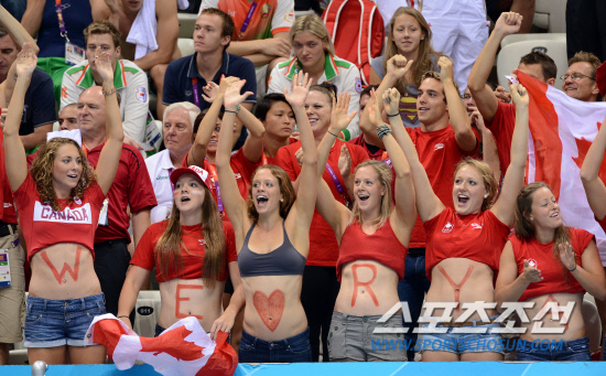 4일 런던올림픽 올림픽파크 아쿠아틱센터에서 열린 여자수영 50m 경기에서 캐나다 응원단들이 자국선수를 열렬히 응원하고 있다./20120804 런던=올림픽사진공동취재단 g