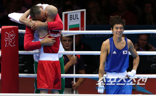 런던올림픽 남자 권투 라이트플라이급(49kg)에 출전한 한국의 신종훈이 4일 오후(현지시각) 런던 엑셀 사우스 아레나에서 열린 16강전에서 불가리아의 알렉산다르 알렉산드로에게 14-15로 판정패 한 뒤 허탈하게 웃고 있다.