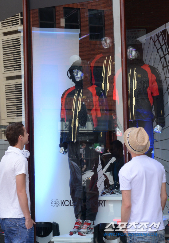 4일 영국 런던의 세계적인 백화점인 헤롯백화점에서 올림픽기간 중 진행되는 '한국 상품 특별전'에서 패션브랜드로는 유일하게 심사에 통과된 코오롱스포츠의 라이프텍 자켓이 쇼윈도우에 전시되어 관심을 끌고 있다./런던=올림픽사진공동취재단