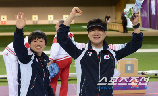 5일 영국 런던 그리니치파크의 왕립 포병대 기지 사격장에서 열린 2012 런던올림픽 남자 50m 공기권총 경승 경기에서 금은메달을 딴 진종오, 최영래가 환호하고 있다./20120805런던=올림픽사진공동취재단