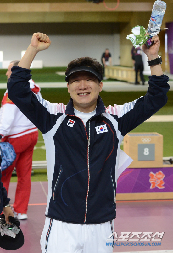 5일 영국 런던 그리니치파크의 왕립 포병대 기지 사격장에서 열린 2012 런던올림픽 남자 50m 공기권총 경승 경기에서 금은메달을 딴 진종오가 환호하고 있다./20120805런던=올림픽사진공동취재단