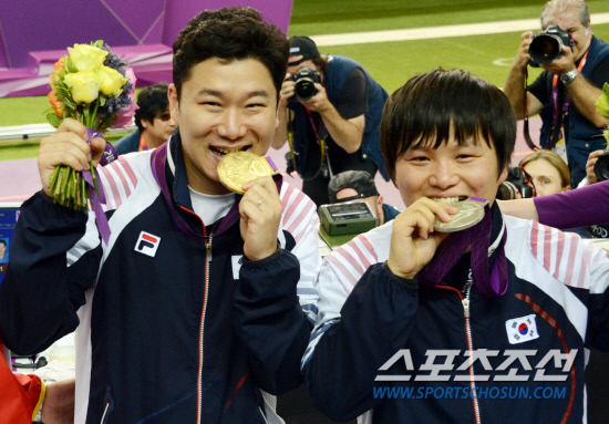 사격 50m 권총 경기에 출전한 진종오,최영래 선수가 5일 영국 런던 그리니치파크의 왕립포병대 기지 사격장에서 열린 결승경기에서 금,은메달을 땄다. 시상식에서 두 선수가 금메달을 깨물고 있다.