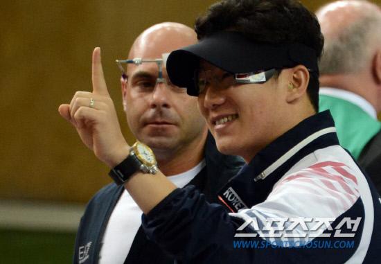사격 50m 권총 경기에 출전한 진종오,최영래 선수가 5일 영국 런던 그리니치파크의 왕립포병대 기지 사격장에서 열린 결승경기에서 금,은메달을 땄다. 진종오 선수가 손가락을 펴보고 있다.