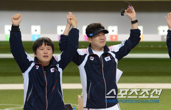5일 영국 런던 그리니치파크의 왕립 포병대 기지 사격장에서 열린 2012 런던올림픽 남자 50m 공기권총 경기에서 금메달 진종오 선수와 은메달 최영래 선수가 환호하고 있다./20120805런던=올림픽사진공동취재단g