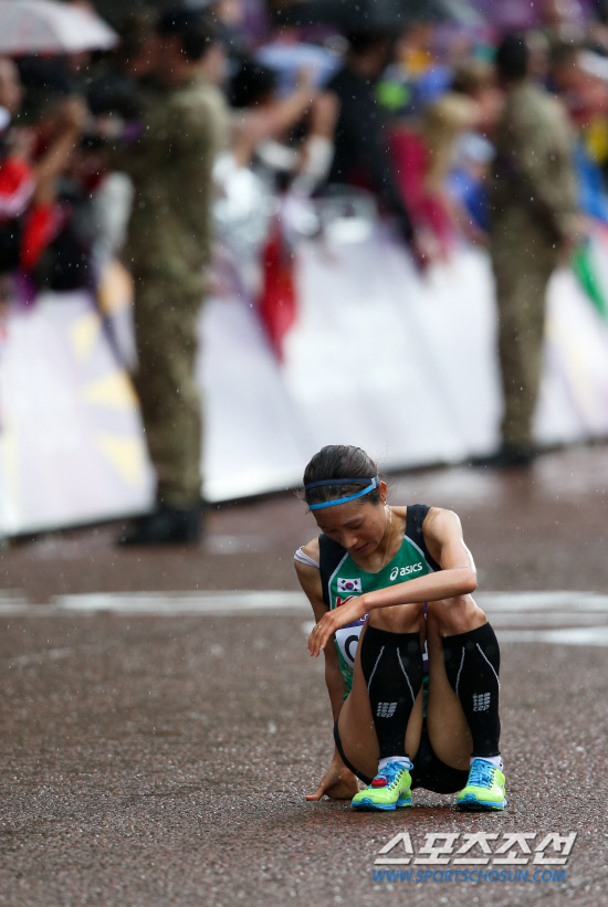 런던올림픽 여자 마라톤에 출전한 한국의 정윤희가 5일 오후(현지시각) 런던 버킹엄 궁전 앞 '더 몰' 결승선에 2시간31분58초(41위)의 기록으로 들어온 뒤 힘들어 하고 있다. 함께 출전한 임경희는 76위, 김성은은 96위에 머물렀다.