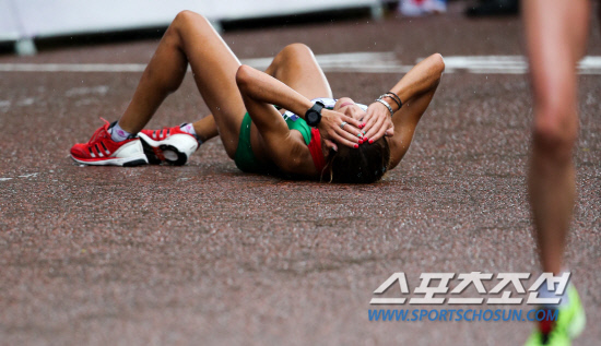 런던올림픽 여자 마라톤에 출전한 포루투갈의 아나 돌체 펠릭스가 5일 오후(현지시각) 런던 버킹엄 궁전 앞 '더 몰' 결승선에 21위로 들어온 뒤 바닥에 쓰러져 있다.