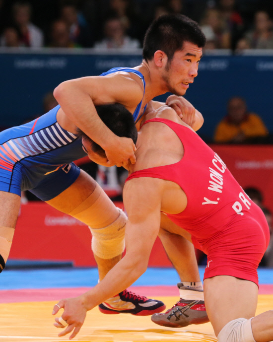 <올림픽>남북대결 (런던=연합뉴스) 서명곤 기자 = 최규진이 5일 오후(현지시간) 영국 런던 엑셀 아레나에서 열린 레슬링 그레코로만형 55㎏급 16강에서 북한 윤원철에게 공격을 하고 있다. 2012.8.5 seephoto@yna.co.kr (끝)