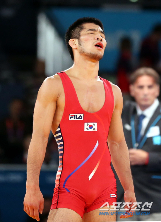 최규진이 5일 영국 런던에 위치한 엑셀 노스 아레나2에서 열린 2012 런던 올림픽 레슬링 남자 그레코로만형 55kg급 준결승서 로브산 바이라모프(아제르바이젠)에 세트 스코어 0-2로 패하며 결승 진출에 실패한후 씁쓸한 표정을 짓고 있다.