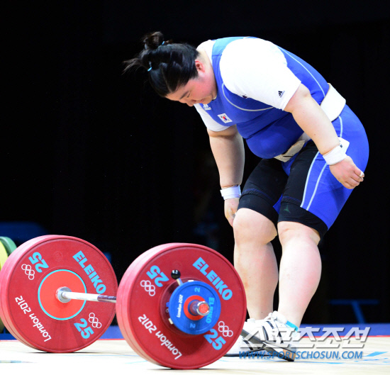 5일(현지시간) 영국 엑셀 런던 사우스 아레나에서 열린 2012런던올림픽 여자 역도 75㎏이상급에 출전해 2회 연속 금메달에 도전하는 장미란이 인상 129kg 도전에 실패하고 있다. 120805.런던=올림픽공동사진기자단E