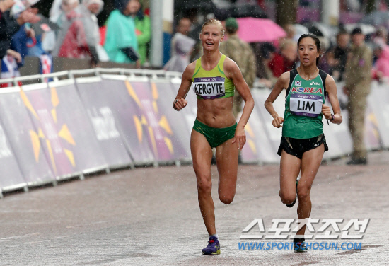 런던올림픽 여자 마라톤에 출전한 한국의 임경희가 5일 오후(현지시각) 런던 버킹엄 궁전 앞 '더 몰' 결승선에 76위로 들어오고 있다.