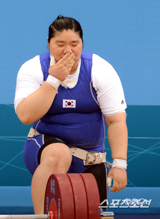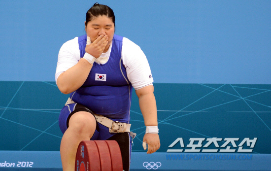 장미란의 아름다운 퇴장!! 5일 오후(현지시간) 영국 런던 엑셀 아레나에서 열린 여자 역도 +75kg급에 출전한 장미란 선수가 용상 3차 시기에서 170kg에 도전하였으나 실패 하였다. 장미란 선수가 매트를 떠나기 전 바벨에 입맞추고 있다20120805런던=올림픽사진공동취재단L