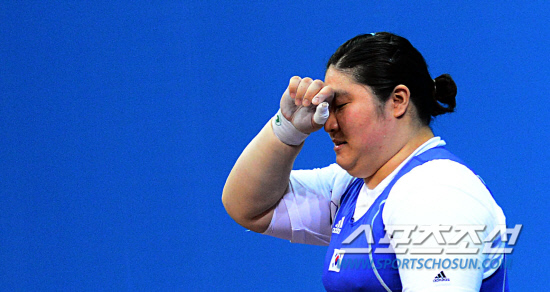 5일(현지시간) 영국 엑셀 런던 사우스 아레나에서 열린 2012런던올림픽 여자 역도 75㎏이상급에 출전해 2회 연속 금메달에 도전한 장미란이 용상3차시기에 실패해 동메달 탈락이 확정된 후 아쉬워하고 있다. 120805.런던=올림픽공동사진기자단E