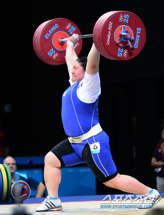 5일(현지시간) 영국 엑셀 런던 사우스 아레나에서 열린 2012런던올림픽 여자 역도 75㎏이상급에 출전해 2회 연속 금메달에 도전한 장미란이 용상3차시기 170kg에 도전하고 있다. 120805.런던=올림픽공동사진기자단E