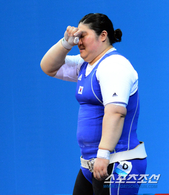 5일(현지시간) 영국 엑셀 런던 사우스 아레나에서 열린 2012런던올림픽 여자 역도 75㎏이상급에 출전해 2회 연속 금메달에 도전한 장미란이 용상3차시기에 실패해 동메달 탈락이 확정된 후 아쉬운듯 얼굴에 손을 대고 있다. 120805.런던=올림픽공동사진기자단E
