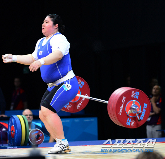 5일(현지시간) 영국 엑셀 런던 사우스 아레나에서 열린 2012런던올림픽 여자 역도 75㎏이상급에 출전해 2회 연속 금메달에 도전한 장미란이 용상3차시기 170kg 도전에 실패하고 있다. 120805.런던=올림픽공동사진기자단E
