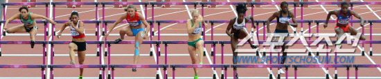 2012 런던올림픽 육상대표팀의 정혜림(왼쪽)이 6일 런던 올림픽 스타디움에서 열린 여자 100m 허들 1라운드에서 레이스를 펼치고 있다.
