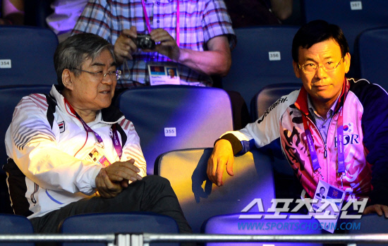 6일 런던 엑셀노우스아레나 경기장에서 여자탁구 단체전 4강전이 열렸다. 조양호 대한탁구협회장(왼쪽)이 경기장을 찾아 대표팀을 응원하고 있다.