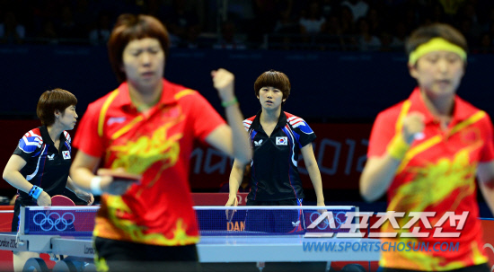 6일 런던 엑셀노우스아레나 경기장에서 여자탁구 단체전 4강전이 열렸다. 당예서, 석하정 조가 세 번째 복식경기에서 중국의 구오워, 리샤오샤 조를 상대했다. 득점을 허용하고 아쉬운 표정을 짓고 있는 석하정, 당예서(왼쪽).