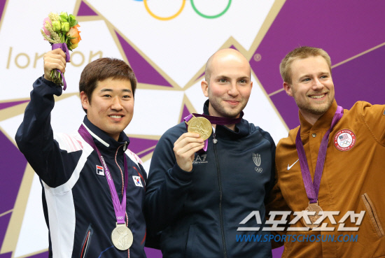 김종현 선수가 6일(한국시간) 영국 런던 그리니치파크의 왕립 포병대 기지 사격장에서 열린 남자 50m 소총 3자세 결선에서 은메달을 획득했다. 시상대에 오른 김 선수가 포즈를 취하고 있다. 20120806. 런던=올림픽사진공동취재단b
