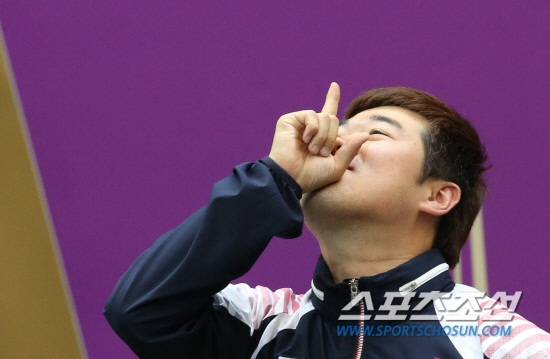 김종현 선수가 6일(한국시간) 영국 런던 그리니치파크의 왕립 포병대 기지 사격장에서 열린 남자 50m 소총 3자세 결선에서 은메달을 획득했다. 시상대에 오른 김 선수가 퍼포먼스를 하고 있다. 20120806. 런던=올림픽사진공동취재단b