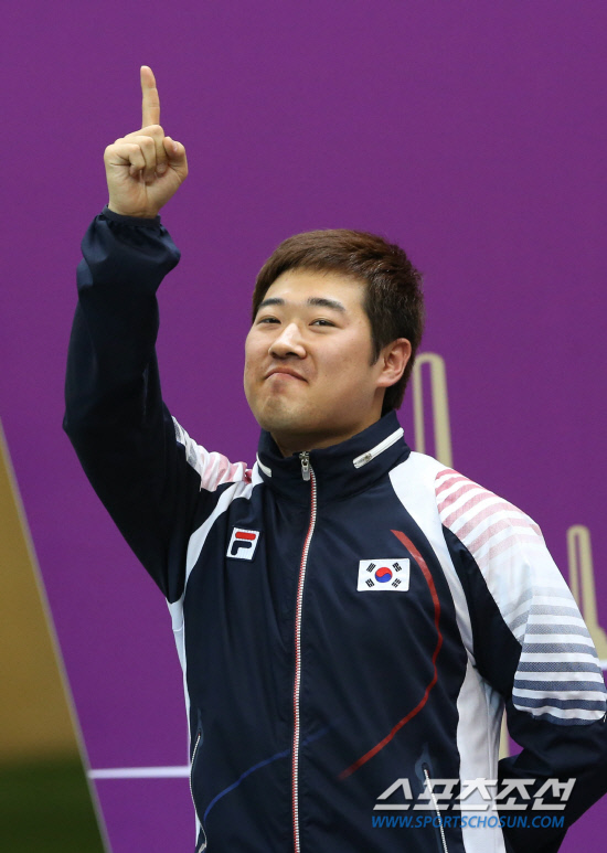 김종현 선수가 6일(한국시간) 영국 런던 그리니치파크의 왕립 포병대 기지 사격장에서 열린 남자 50m 소총 3자세 결선에서 은메달을 획득했다. 시상대에 오른 김 선수가 퍼포먼스를 하고 있다. 20120806. 런던=올림픽사진공동취재단b