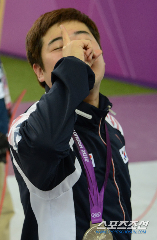 김종현 선수가 6일(한국시간) 영국 런던 그리니치파크의 왕립 포병대 기지 사격장에서 열린 남자 50m 소총 3자세 결선에서 은메달을 획득했다. 시상식을 마친 김 선수가 포즈를 취하고 있다. 20120806. 런던=올림픽사진공동취재단b