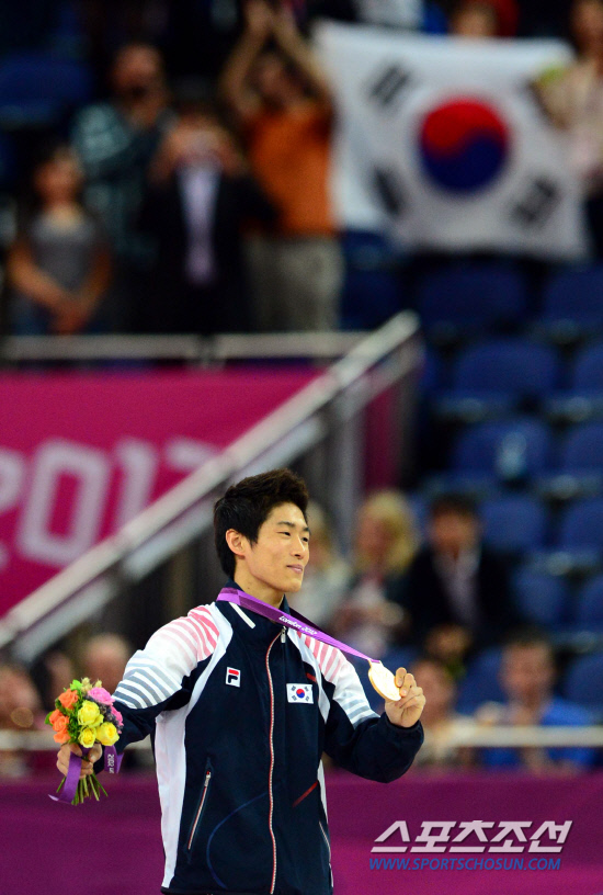 2012 런던올림픽 체조대표팀의 양학선이 6일(현지시간) 런던의 노스 그리니치 아레나에서 열린 기계체조 남자 도마 결선에서 금메달을 목에 걸고 있다.
