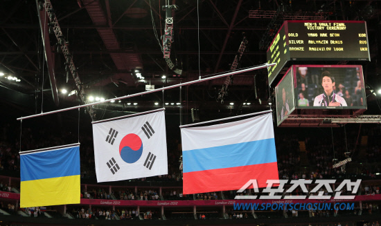 런던올림픽 남자 체조 도마에 출전한 한국의 양학선이 6일 오후(현지시각) 런던 노스그리니치 아레나에서 열린 결선 경기에서 한국 남자 체조 첫 금메달을 따냈다. 시상식에서 태극기가 게양대 맨 위에 올라가고 있다.