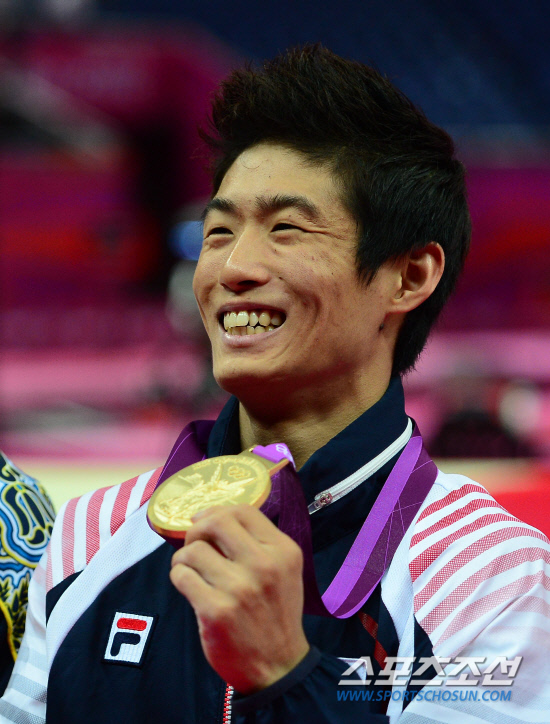 6일(현지시간) 영국 런던 노스그린위치 아레나에서 열린 2012런던올림픽 남자체조 뜀틀분문에서 금메달을딴 양학선이 시상식에서 메달을 들어보고 있다. 120806.런던=올림픽공동사진기자단E