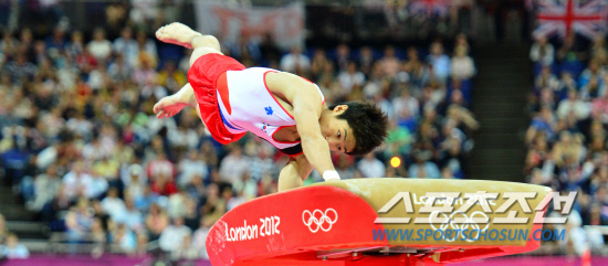 양학선이 6일 오후(현지시간) 런던 노스 그리니치 아레나에서 열린 기계체조 남자 도마 결선에서 힘찬 도약을 하고 있다.