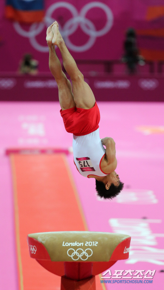 런던올림픽 남자 체조 도마에서 한국 남자 체조 사상 첫 금메달을 따낸 양학선이 6일 오후(현지시각) 런던 노스그리니치 아레나에서 열린 결선 경기 1차 시기에서 멋진 연기를 펼치고 있다.