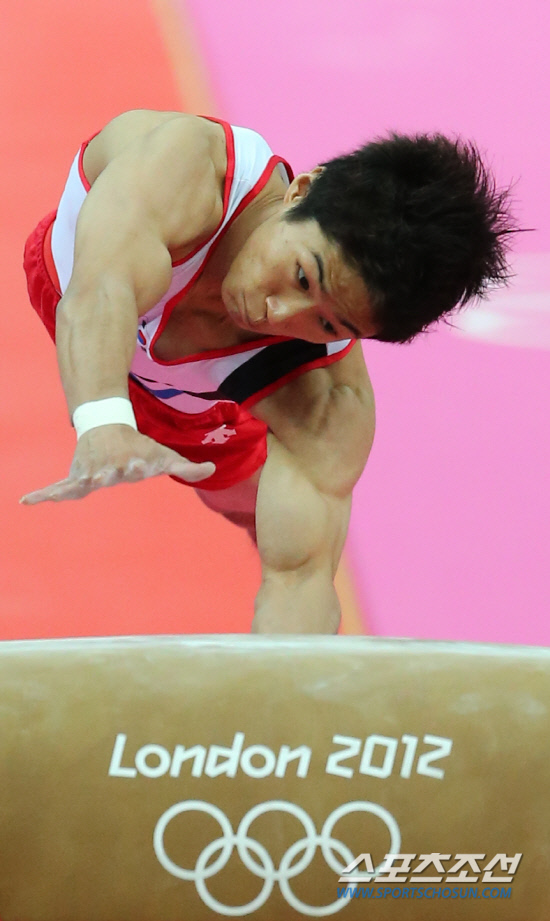 런던올림픽 남자 체조 도마에서 한국 남자 체조 사상 첫 금메달을 따낸 양학선이 6일 오후(현지시각) 런던 노스그리니치 아레나에서 열린 결선 경기 2차 시기에서 힘차게 뛰어 오르고 있다.