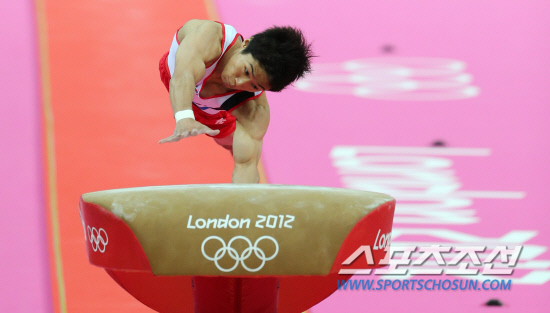 런던올림픽 남자 체조 도마에서 한국 남자 체조 사상 첫 금메달을 따낸 양학선이 6일 오후(현지시각) 런던 노스그리니치 아레나에서 열린 결선 경기 2차 시기에서 힘차게 뛰어 오르고 있다.