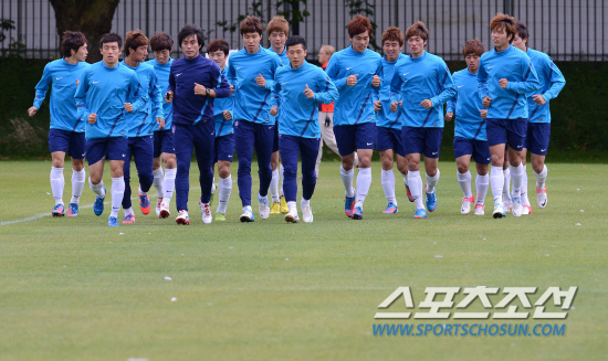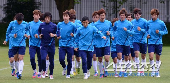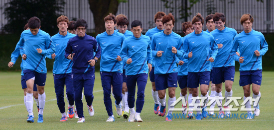 올림픽 축구대표팀 선수들이 6일(현지시간) 영국 맨체스터 Grammar School에서 열린 훈련에서 가벼운 달리기로 몸을 풀고 있다.
