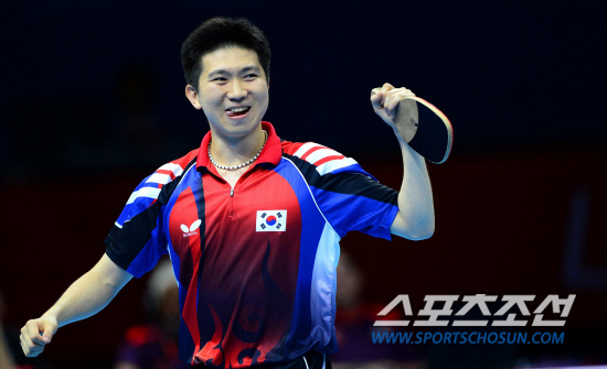 '남자탁구 단체팀이 결승에 진출했다' 6일 런던 엑셀노우스아레나 경기장에서 남자탁구 단체전 4강전이 열렸다. 남자대표팀은 홍콩에 3대0 완승을 거두며 결승에 진출 했다. 첫 번째 경기에 출전한 유승민이 승리를 확정하고 주먹을 쥐어보이고 있다.