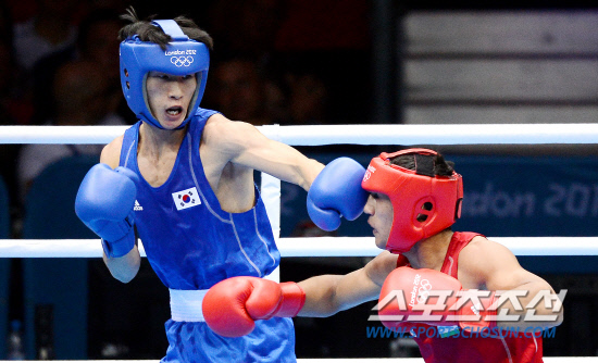 6일 밤(현지시각) 런던 엑셀 사우스 아레나에서 열린 2012런던올림픽 복싱 남자 라이트급 8강전에서 한국 한순철이 우즈베키스탄 파즐리딘 가이브나자로프에게 펀치를 날리고 있다.20120806런던=올림픽사진공동취재단L