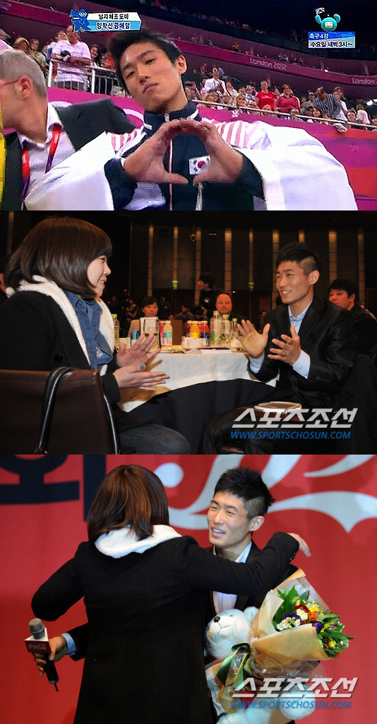 양학선은 금메달을 딴 직후 하트 세리머니를 했다. 부모님, 한국의 팬들을 향한 포즈였겠지만 여자친구를 향한 마음도 녹아있었을 것이다. <스포츠조선닷컴>