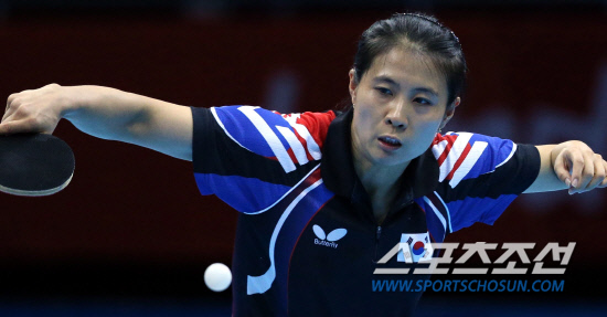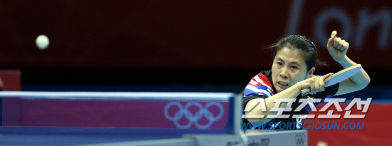 김경아, 석하정, 당예서가 팀을 이룬 대표팀은 7일 영국 런던의 엑셀 런던 노스아레나에서 열린 대회 여자 단체전 3-4위전에서 김경아선수가 첫 단식에서 싱가폴팀과 경기하고 있다.