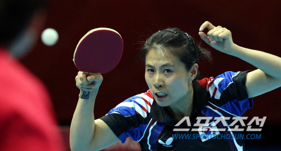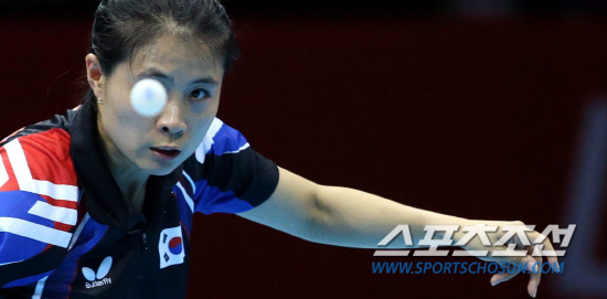 김경아, 석하정, 당예서가 팀을 이룬 대표팀은 7일 영국 런던의 엑셀 런던 노스아레나에서 열린 대회 여자 단체전 3-4위전에서 김경아선수가 첫 단식에서 싱가폴팀과 경기하고 있다.