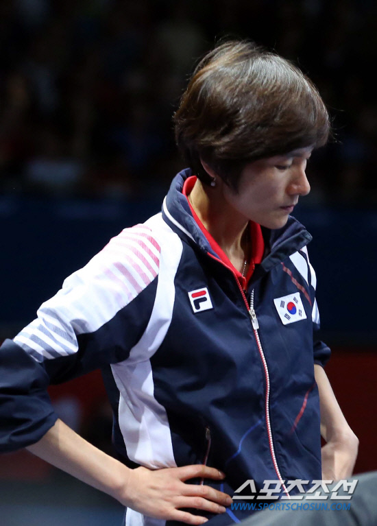 김경아, 석하정, 당예서가 팀을 이룬 대표팀은 7일 영국 런던의 엑셀 런던 노스아레나에서 열린 대회 여자 단체전 3-4위전에서 3-0으로 패한후 현정화감독이 아쉬워하고 있다.