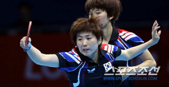 김경아, 석하정, 당예서가 팀을 이룬 여자탁구대표팀이 7일 영국 런던의 엑셀 런던 노스아레나에서 열린 대회 여자 단체전 3-4위전 경기를 펼쳤다. 3번째 복식(석하정-당예서)경기에서 당예서가 공격하고 있다.