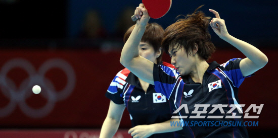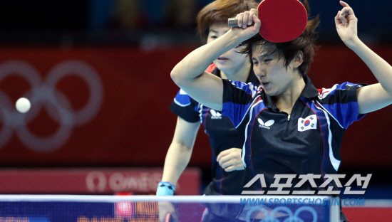 김경아, 석하정, 당예서가 팀을 이룬 여자탁구대표팀이 7일 영국 런던의 엑셀 런던 노스아레나에서 열린 대회 여자 단체전 3-4위전 경기를 펼쳤다. 3번째 복식(석하정-당예서)경기에서 석하정이 공격하고 있다.