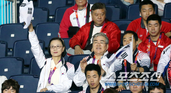 김경아, 석하정, 당예서가 팀을 이룬 대표팀은 7일 영국 런던의 엑셀 런던 노스아레나에서 열린 대회 여자 단체전 3-4위전에 조양호 대한탁구협회회장이 응원하고 있다.