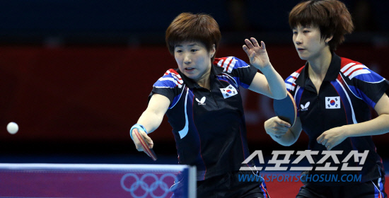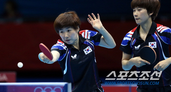 김경아, 석하정, 당예서가 팀을 이룬 여자탁구대표팀이 7일 영국 런던의 엑셀 런던 노스아레나에서 열린 대회 여자 단체전 3-4위전 경기를 펼쳤다. 3번째 복식(석하정-당예서)경기에서 당예서가 공격하고 있다.
