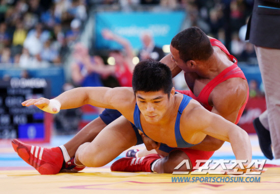 7일오후(현지시각) 영국 런던 엑셀 노스아레나2에서 열린 남자 레슬링 그레코로만형 66kg급 16강 경기에서 김현우 선수가 페드로 뮬렌스 에레라(쿠바)와 시합을 하고 있다. 김현우는 뮬렌스 에레라를 가볍게 꺽고 8강에 안착했다. 20120807 런던=올림픽사진공동취재단m