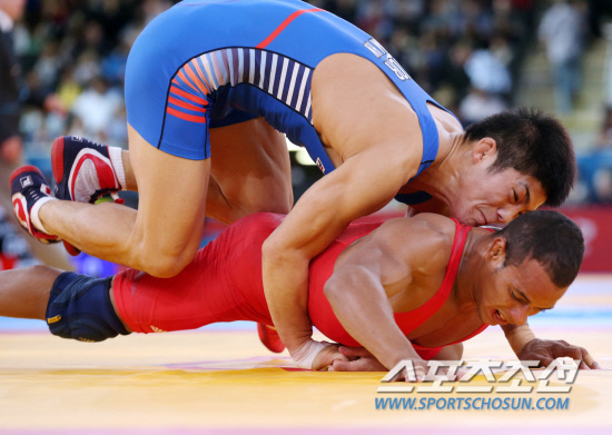 7일오후(현지시각) 영국 런던 엑셀 노스아레나2에서 열린 남자 레슬링 그레코로만형 66kg급 16강 경기에서 김현우 선수가 페드로 뮬렌스 에레라(쿠바)와 시합을 하고 있다. 김현우는 뮬렌스 에레라를 가볍게 꺽고 8강에 안착했다. 20120807 런던=올림픽사진공동취재단m