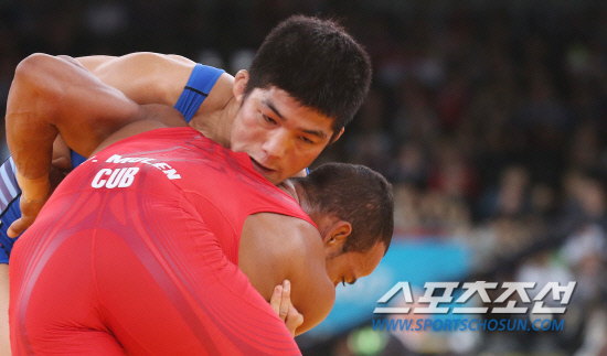 7일오후(현지시각) 영국 런던 엑셀 노스아레나2에서 열린 남자 레슬링 그레코로만형 66kg급 16강 경기에서 김현우 선수가 페드로 뮬렌스 에레라(쿠바)와 시합을 하고 있다. 김현우는 뮬렌스 에레라를 가볍게 꺽고 8강에 안착했다. 20120807 런던=올림픽사진공동취재단m