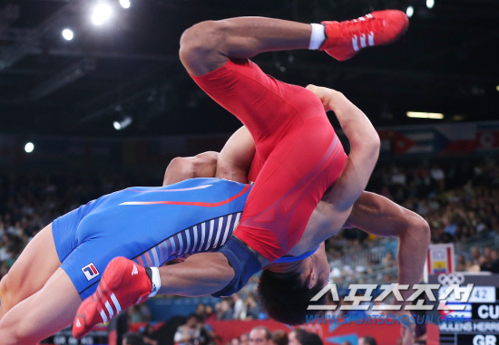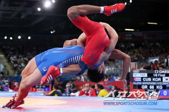 7일 오후(현지시각) 영국 런던 엑셀 노스아레나2에서 열린 남자 레슬링 그레코로만형 66kg급 16강 경기에서 김현우가 페드로 뮬렌스 에레라(쿠바)와 시합을 하고 있다. 김현우는 뮬렌스 에레라를 가볍게 꺽고 8강에 안착했다.