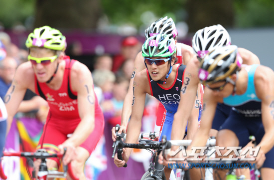 한국의 허민호(15번) 등 런던올림픽 남자 트라이애슬론(철인3종) 출전 선수들이 7일 오후(현지시각) 런던 하이드파크에서 열린 결선 경기에서 자전거 경주를 펼치고 있다. 트라이애슬론은 수영 1.5km, 자전거 43km, 달리기 10km 등 세 종목을 뛰는 경기로 세 종목을 완주하면 '철인'이라는 칭호를 준다. 1시간54분30초만에 결승선을 통과한 허민호는 55명의 출전 선수(1명 실격) 중 최하위인 54위를 기록했다. 1위는 1시간46분25초를 기록한 영국의 앨리스태어 브라운리가 차지했다.