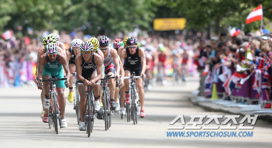 한국의 허민호(15번) 등 런던올림픽 남자 트라이애슬론(철인3종) 출전 선수들이 7일 오후(현지시각) 런던 하이드파크에서 열린 결선 경기에서 자전거 경주를 펼치고 있다. 트라이애슬론은 수영 1.5km, 자전거 43km, 달리기 10km 등 세 종목을 뛰는 경기로 세 종목을 완주하면 '철인'이라는 칭호를 준다. 1시간54분30초만에 결승선을 통과한 허민호는 55명의 출전 선수(1명 실격) 중 최하위인 54위를 기록했다. 1위는 1시간46분25초를 기록한 영국의 앨리스태어 브라운리가 차지했다.
